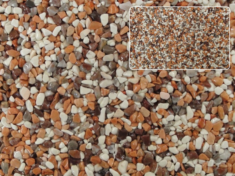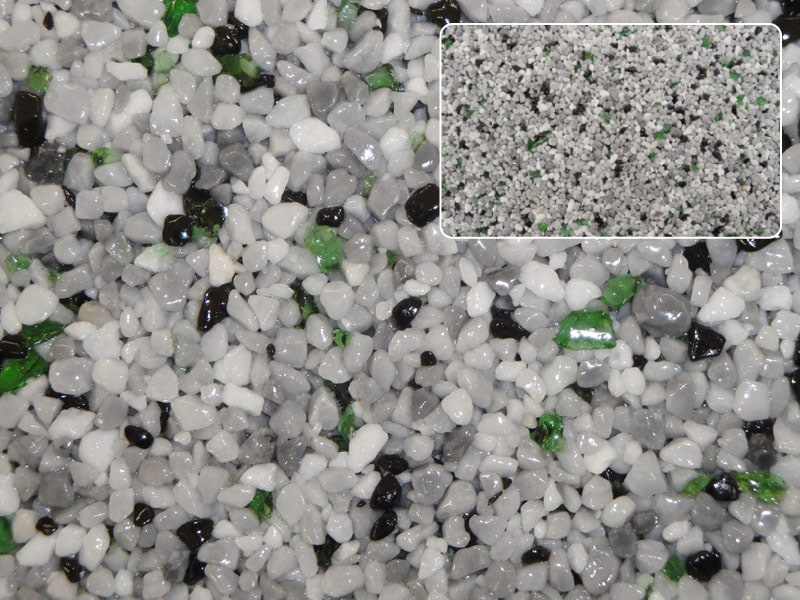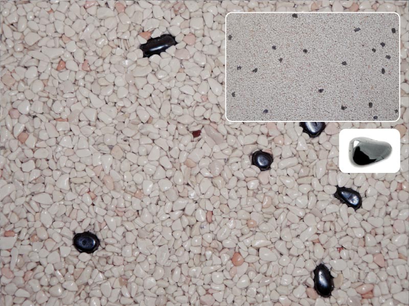 Der Steinteppich besteht aus hochwertigem, mit Reaktionsharz gebundenem Marmorkies, und wird ergänzt durch ein ganzes System aufeinander abgestimmter Komponenten. Im Gegensatz zu herkömmlichen Spachtelungen aus Natursteinsplit ist unser System flexibel, wodurch viele Vorteile und Besonderheiten entstehen: